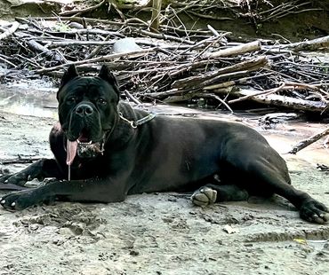 Z has great bone, very robust head that shows great expression. Zara has a nice body with a strong top line and big round feet. Her temperament is stellar, and she loves and protects her family dearly . Zara has typical Cane Corso traits; very protective, loyal and no slouch. She is the Queen of Canadian Shield and the one who started it all; she is in replaceable, touches and holds a close place in my heart! She is simply one of a kind! Zara has produced outstanding temperments, well rounded stable guardians, versatile enough to do what ever comes at them, temperments I would trust whole heartily with children of all ages. Zara has produced amazing working dogs who have reached a higher level and competed in iron dog as well as high classified obedience titles. On down time you will catch Zara enjoying her retirement spayed, sunbasking on my porch, truck rides, sucking her stuffy or doing what she adores which is hanging out horse camping or trail riding with me.