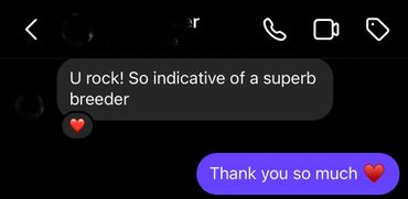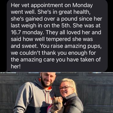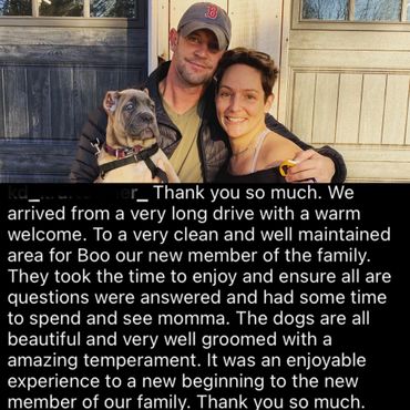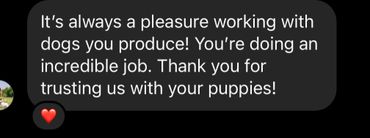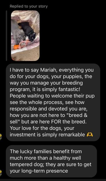 Our experience with Mariah has been amazing! Highly recommend, there's no one better. It was our first time getting a dog from a breeder and she couldn't have made the process any easier. From the beginning she was very clear and concise, lays everything out for you. The care and passion she has for her pups is unmatched and when you get a dog from her it really feels like you're a part of the family. Don't be shy to ask her any questions, she'll gladly answer all of them! I never thought in a million years I'd have such a well behaved puppy and it's due to the fact that her dogs have been bred to have amazing temperament. Thank you so much Mariah! Much love from Sara, Phil and our little Sterling ❣