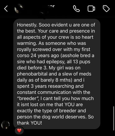 I recently had a wonderful experience with Mariah at Canadian Shield Cane Corso, and I can't recommend them highly enough! From the start, it was clear that Mariah is incredibly knowledgeable about the breed. Her passion for Cane Corsos truly shines through in every interaction.